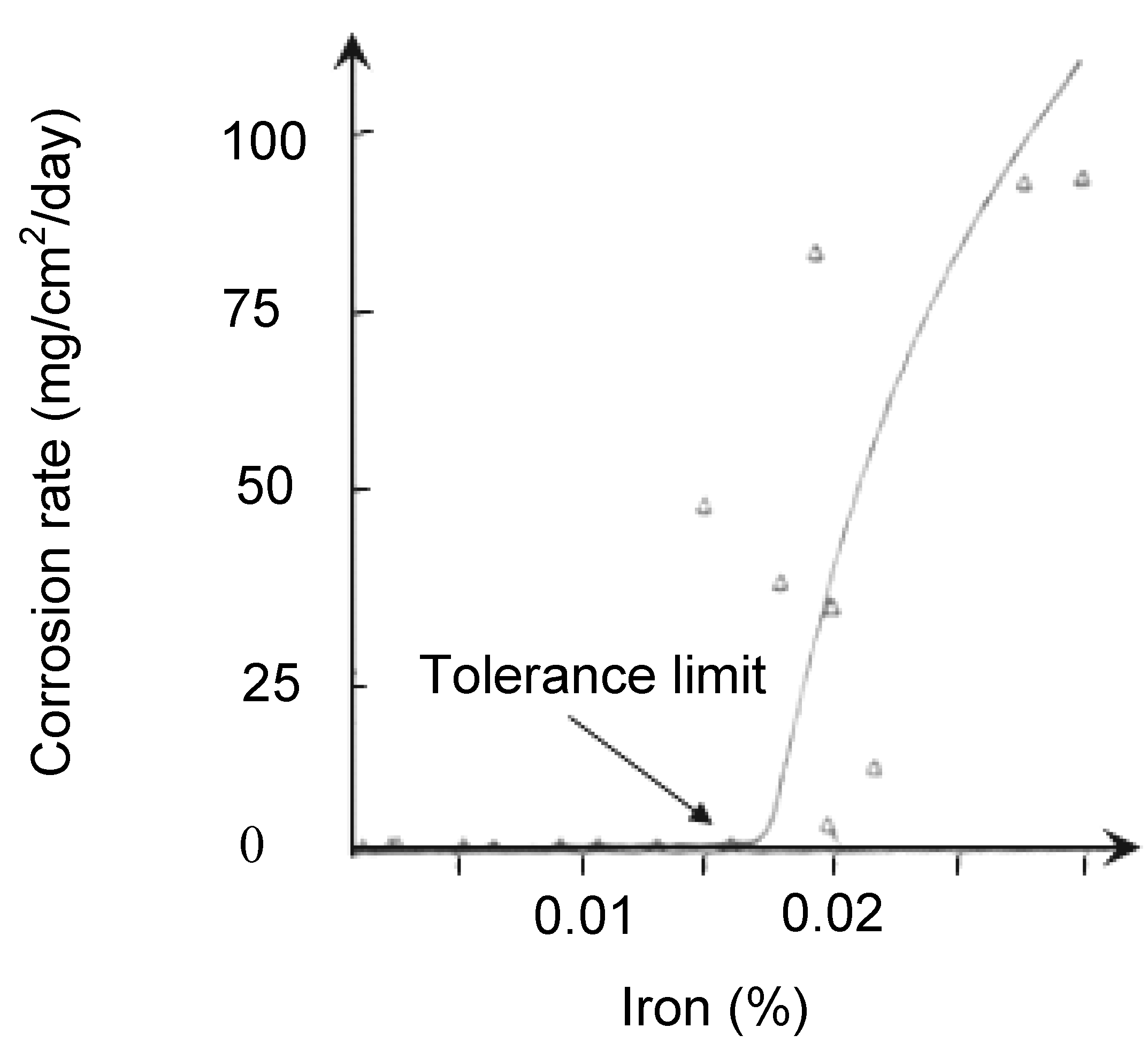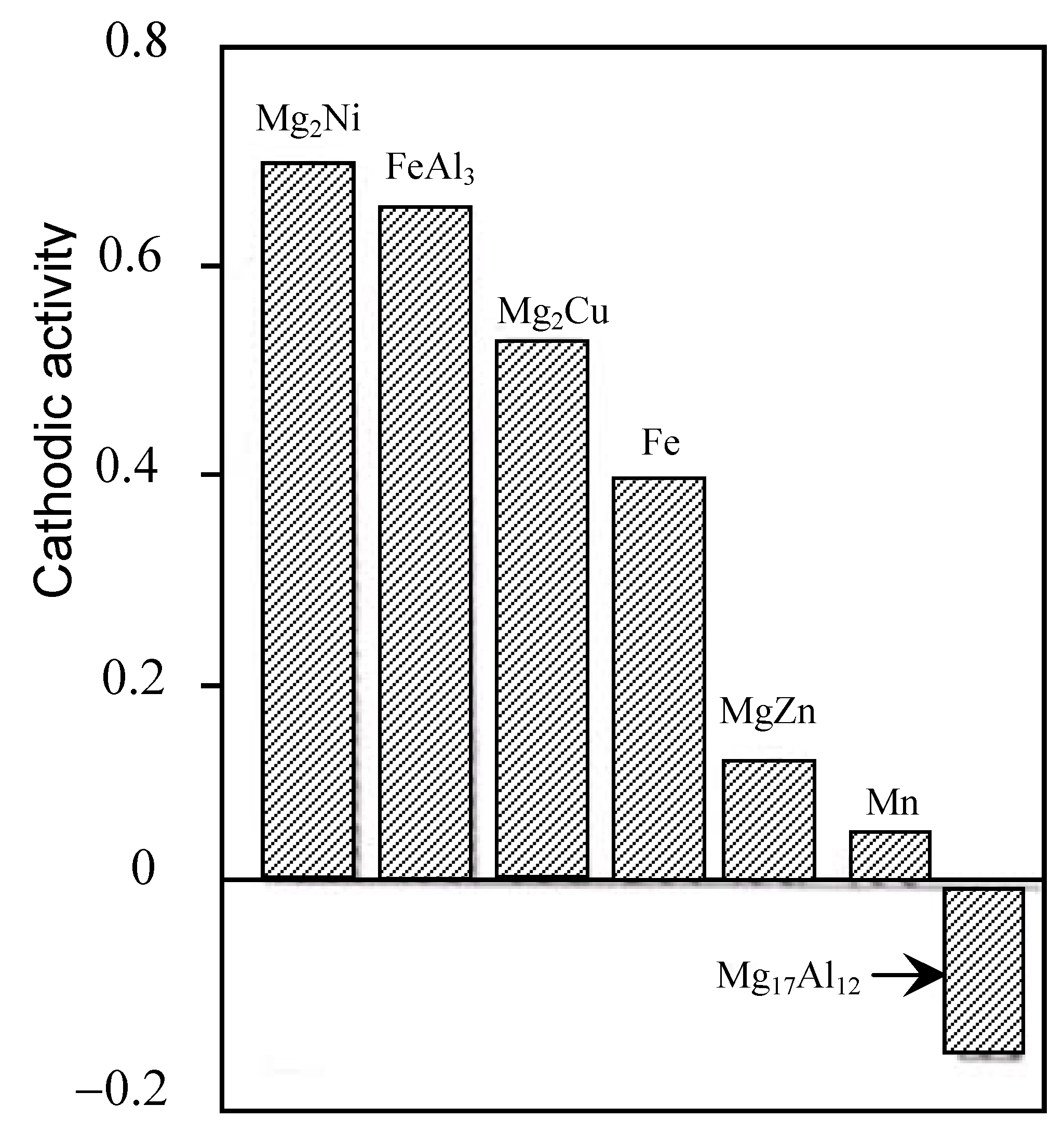 在图4中,根据相对于合金基体的电极电势以及氢气放出的过电势值来定义这些相的影响。在适当的介质中,FeAl 3充当有效的阴极,催化还原反应,氢气的释放,这是腐蚀过程的原因。由于FeAl 3在镁中的溶解度低,增加Al的添加量会导致对Fe [ 17]。例如,当甚至少至数百ppm的铝被添加到镁时,铁的公差极限从170wt.-ppm降低到几个wt.-ppm。Al含量为7%时,Fe的公差约为5 wt.-ppm,而Al含量为10%时,其极限值太低,无法确定[ 13 ]。