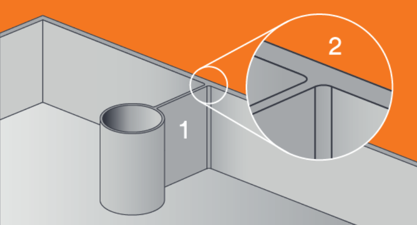 如在此示例(1)和特写插图(2)中所看到的,圆角是弯曲的表面,肋与壁相交,以帮助消除尖角周围的额外机械应力。 圆角和半径